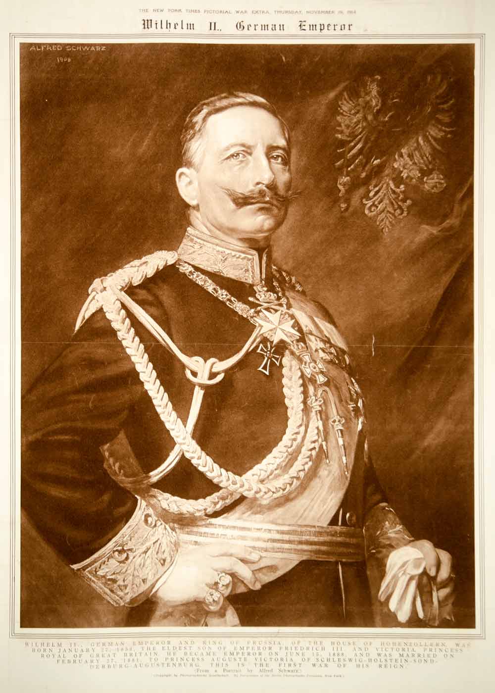 This is an original 1914 large-format sepia rotogravure of a portrait painting by Alfred Schwarz of Wilhelm II, the German Emperor and King of Prussia during World War I.