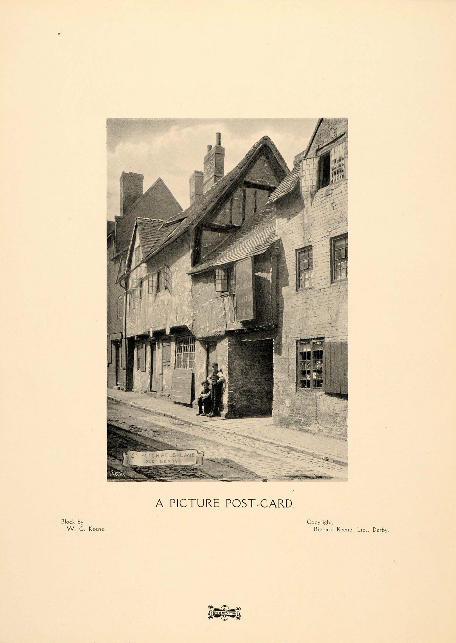 This is an original 1907 halftone print of St Michael's Lane in Derby, England on the River Derwent. Picture postcard copyright by Richard Keene, Ltd. Block by W. C. Keene.