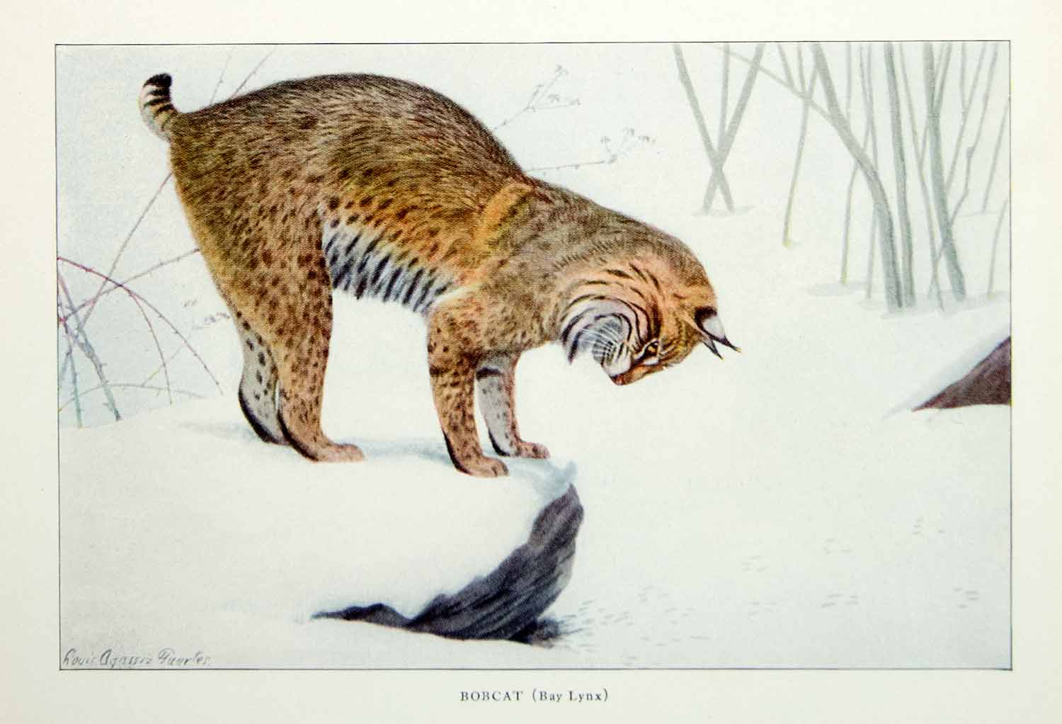 This is an original 1916 color print of a Bobcat, also known as a Bay Lynx, by Louis Agassiz Fuertes.