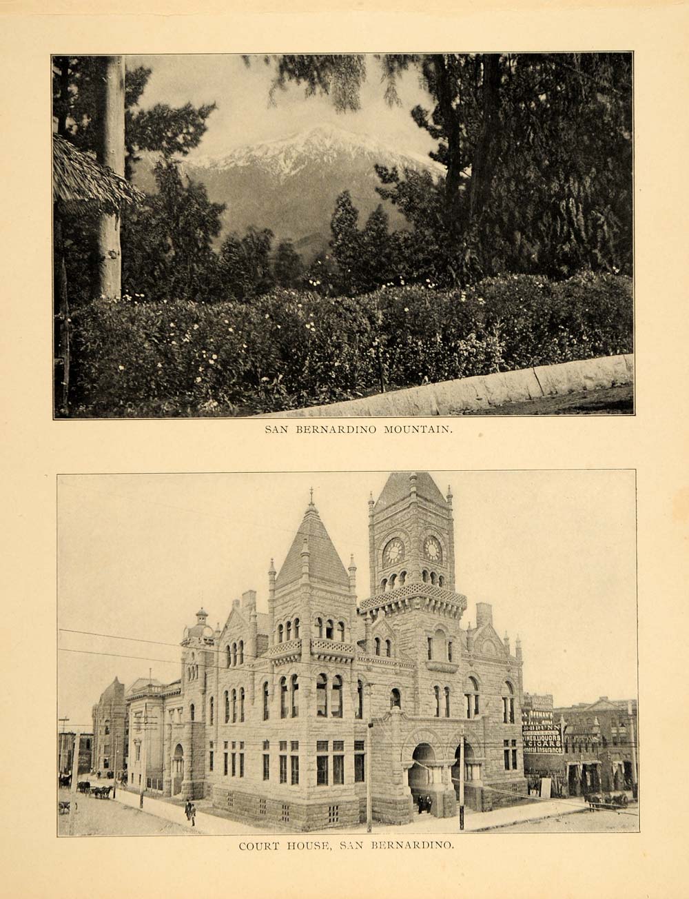 This is an original 1906 print with two halftone images: San Bernardino Mountain and the Court House in San Bernardino, California. Each image measures approx. 6 x 3.75 inches. (Please note that there is printing on the reverse.)