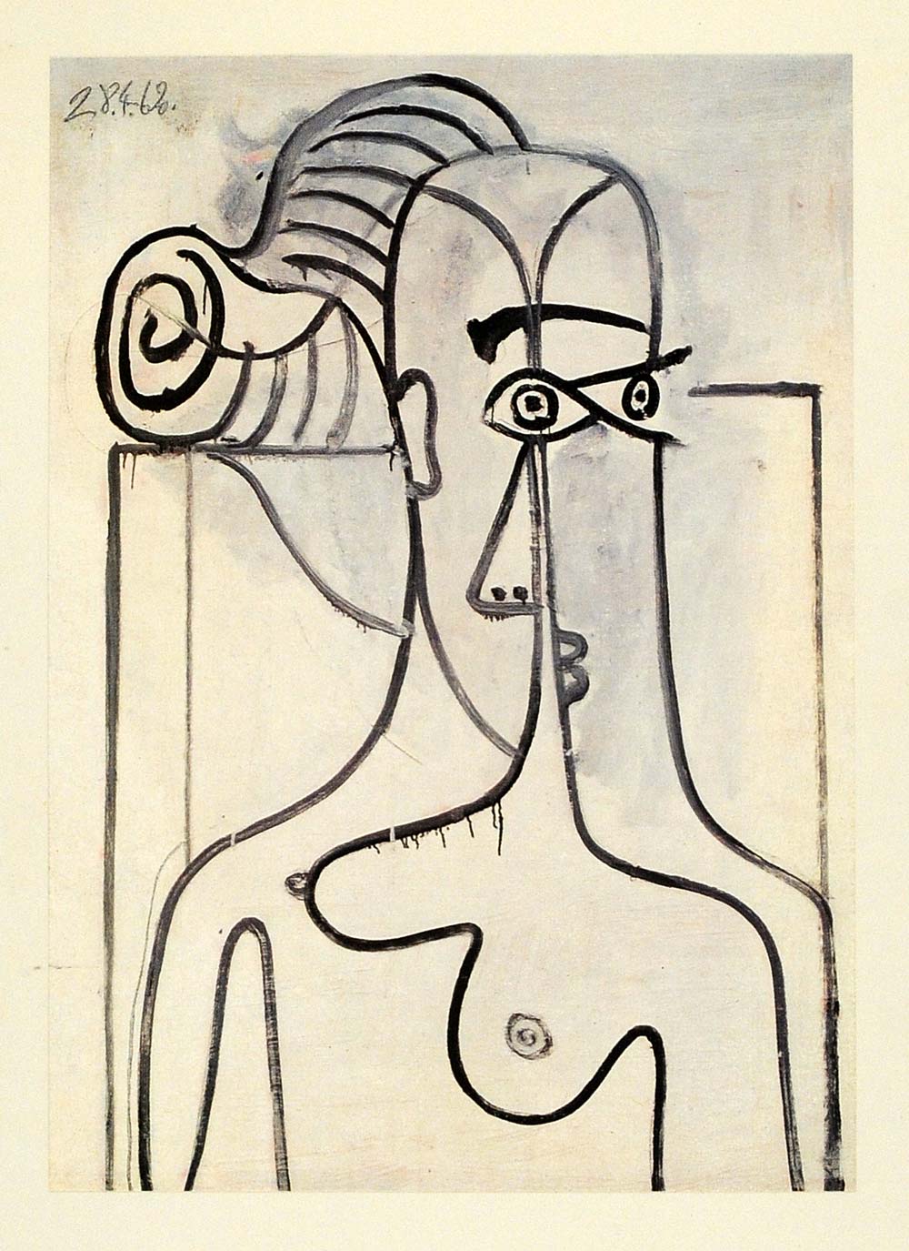 This item is labeled as a work completed on April 28, 1962, originally on canvas at a size of approximately 41x29 and is a distorted nude portrait illustration. Dated in the plate. The item is still mounted to the board from the portfolio. There is nothing printed on the verso of the tipped color print. (Please note that there is printing on the verso of the mounting board.) The color print was printed in France in 1964 and any text below it on the board was printed in the Holland. It was hand-mounted in West Germany.