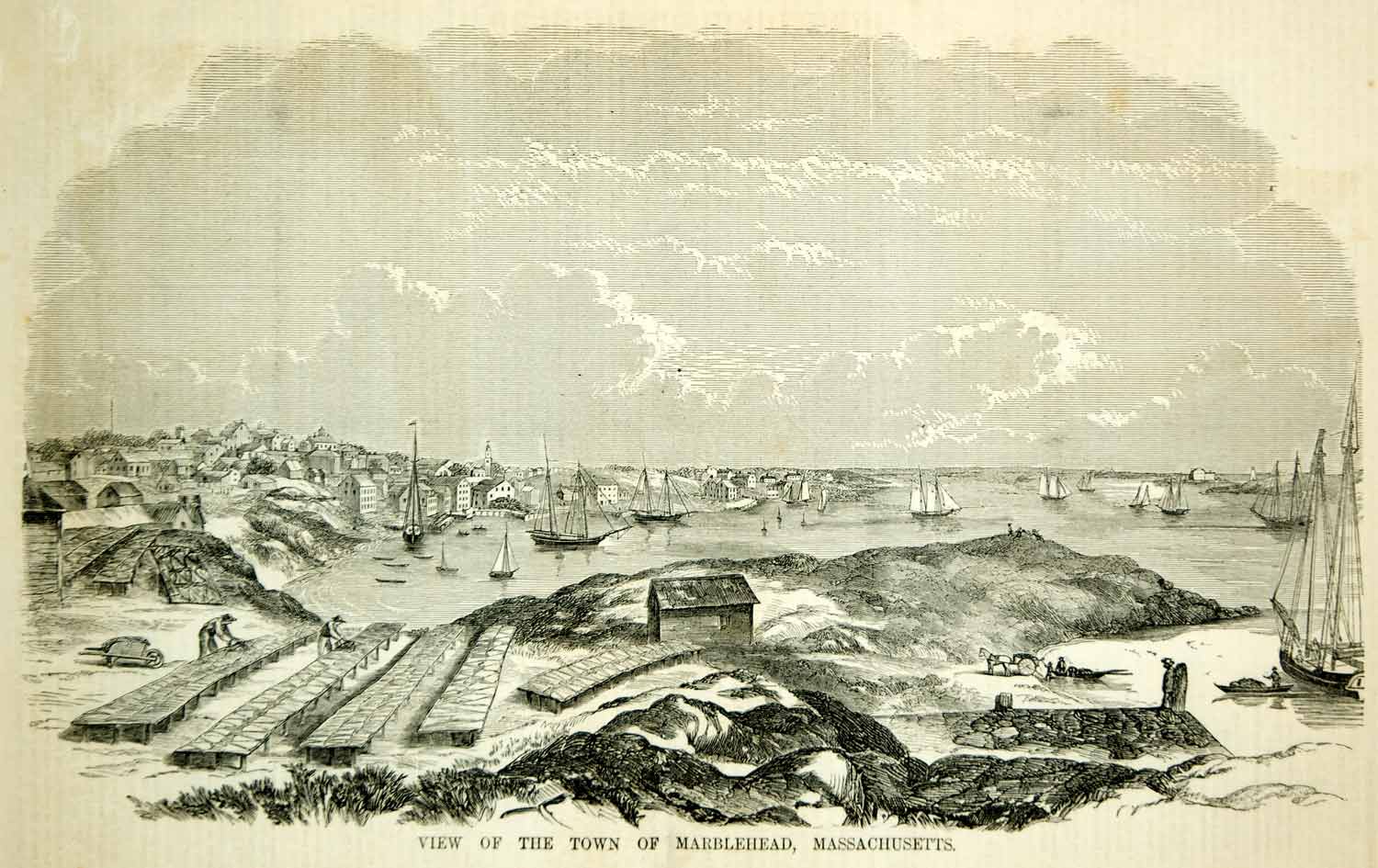 This is an original 1854 black and white in-text wood engraving of the town of Marblehead, Massachusetts.