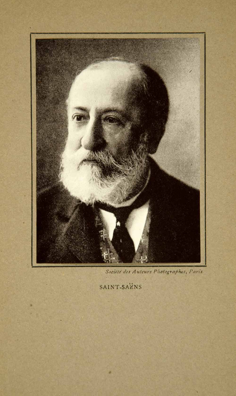 This is an original 1914 black and white tipped-in halftone print of French, Romantic era music composer, conductor, organist, and pianist, Charles-Camille Saint-Saëns, or Sannois, (1835-1921). Some of his famous musical works include, The Carnival of Animals, Samson and Delilah, and Piano Concerto No. 2.