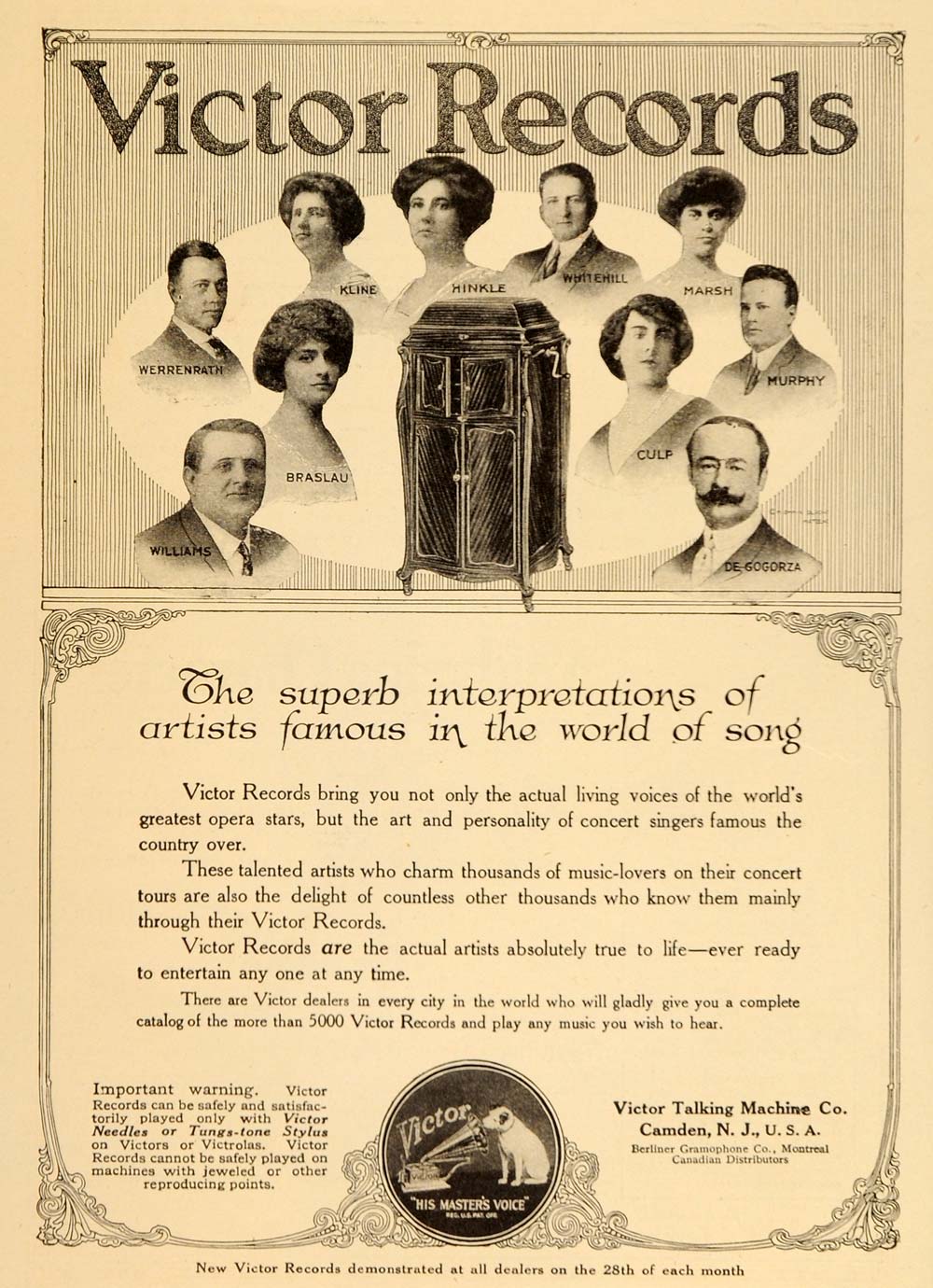 This is an original 1916 black and white print ad for Victor Records with small halftone images of some of the many concert and opera singers who have recorded on Victor Records: Williams; Braslau; Werrenrath; Kline; Hinkle; Whitehill; Marsh; Culp; Murphy; and De Gogorza.