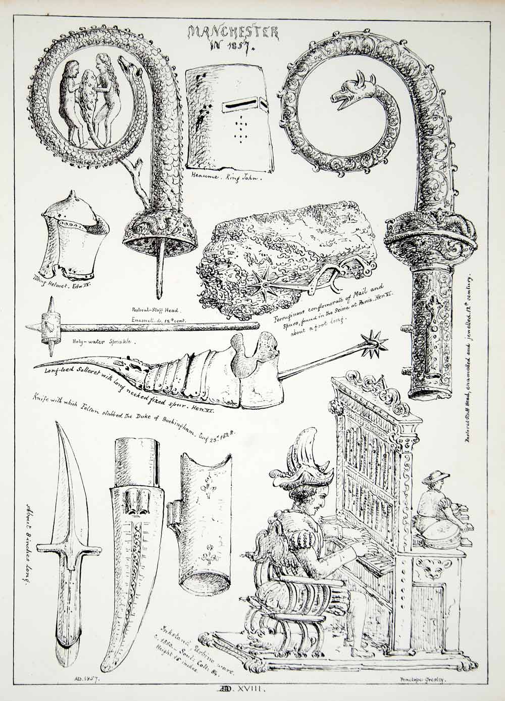 This is an original 1857 black and white lithograph of an illustration by Penelope Gresley of 12th century copper gilt and blue enamel pastoral staff heads, a great helm or heaume from the reign of King John of England that was found at Eynsford Castle in Kent, a tilting helm from the reign of King Henry VI of England, a 15th century aspergillum, (holy water sprinkler), a pair of 15th century riding spurs, a sabaton or solleret from the reign of King Henry VI of England, the dagger that was used by the assassin John Felton to stab George Villiers, 1st Duke of Buckingham to death in the Greyhound Pub in Portsmouth on August 23, 1628, and an organist in period costume playing the organ.